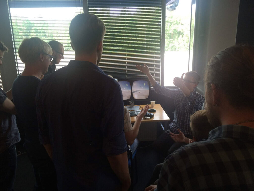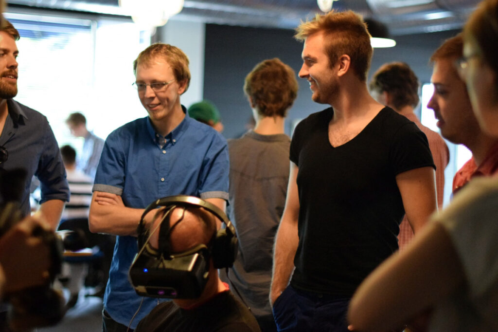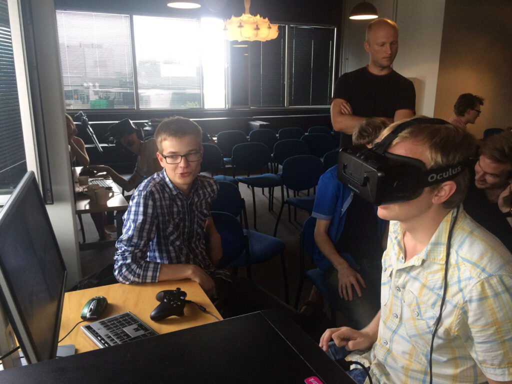 The demo sessions can be summarized with the words of one of the participants: “I have never seen so many Oculus Rifts together in one room!” Criffin had their latest prototypes on display for anyone to try out, this included a full body tracking system and two cool RunPads (ideally suited for Filipp’s EvilMech runner!). Madis held the first public test of his change blindness experiment, where one must spot changes in a virtual room (a devilishly difficult task), somewhat resembling Sightline: the Chair demo. Siim Raidma was back once again with his laser turret battle, this time with added multiplayer support! People were also stunned by Ambient Flight and couldn’t get enough of paragliding over the mountaintops (wind effects included). Keeping things down to earth, Keijo Koort brought out his impressive collection of driving games from Euro Truck simulator to Project Cars and Assetto Corsa. One players was so immersed he nearly killed the gear shift. Also, the funky music from a cool top-down shooter Nighttime Terror filled the room constantly. After three hours of fun and games people were ready to return to present reality.