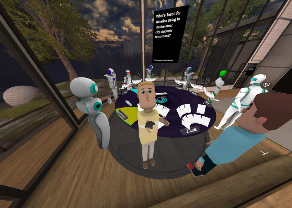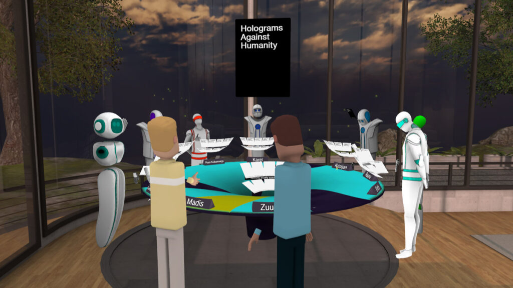 After the “official” part of the event we took on some of the leisure activities that Altspace has to offer. We specifically picked the “Game room” for our event so we had access to some simple experiences/experiments. Even though gaming is not the main focus of Altspace, we found some pretty nice activities. Arguably the most popular was Holograms Against Humanity, a VR version of the classic and humorous card game where anything goes. How much VR adds to the experience of a plain card game is another question. We also tried to shoot some flying plates, try our hand at a tron-like mini game and marveled at the miniature earth that showed the location of all the participants in the room (even though the event was in estonian, we were visited by many different coutries. Yes, even from Uganda).